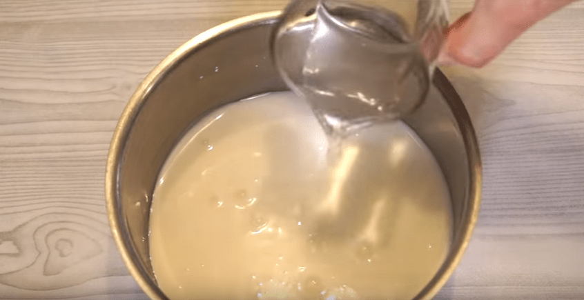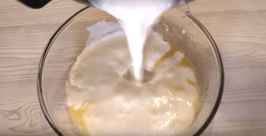 - Подогреваем кефир до комнатной температуры, а воду (сыворотку) – чуть больше, но не до горячего состояния.