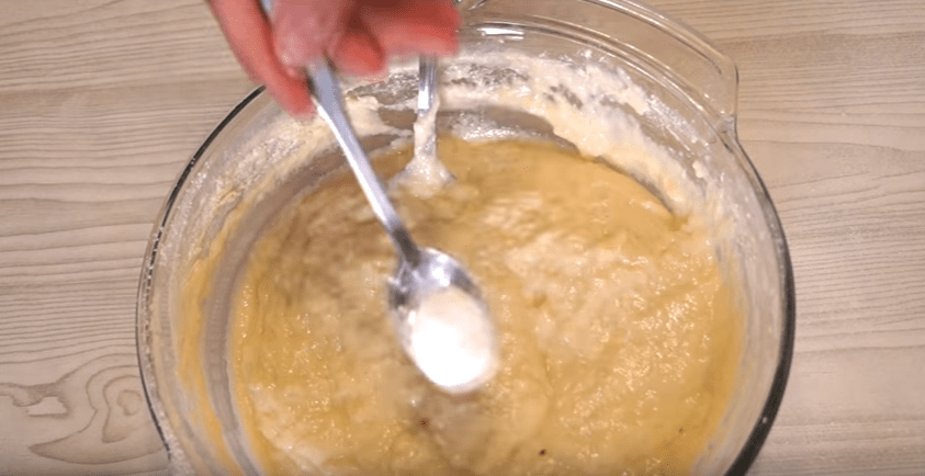 Именно в этот момент лучше всего добавлять соду и хорошенько еще раз перемешать тесто.