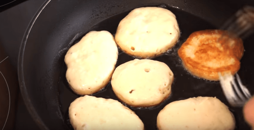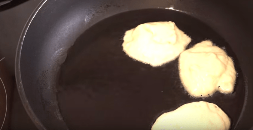 Оладышки жарят с обеих сторон по 2 минуты. Затем складывают на бумажные полотенца, чтобы удалить лишний жир.