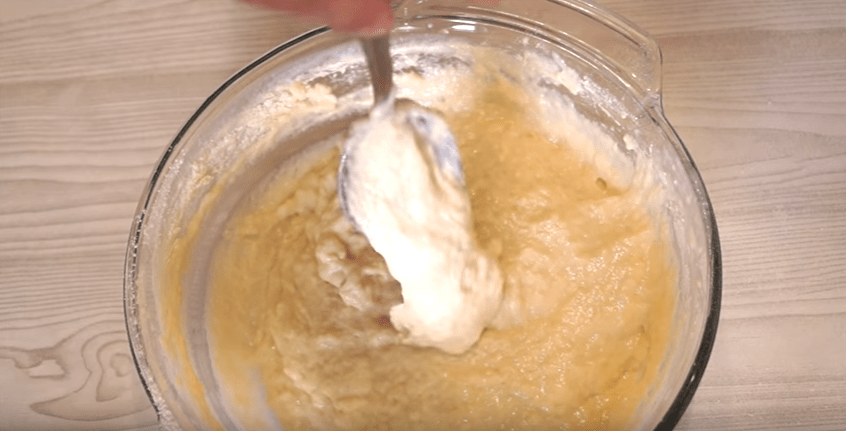 3. В несколько этапов добавь муку, чтобы тесто вышло достаточно густым. Интенсивно взбивать не нужно – просто перемешай до однородности.