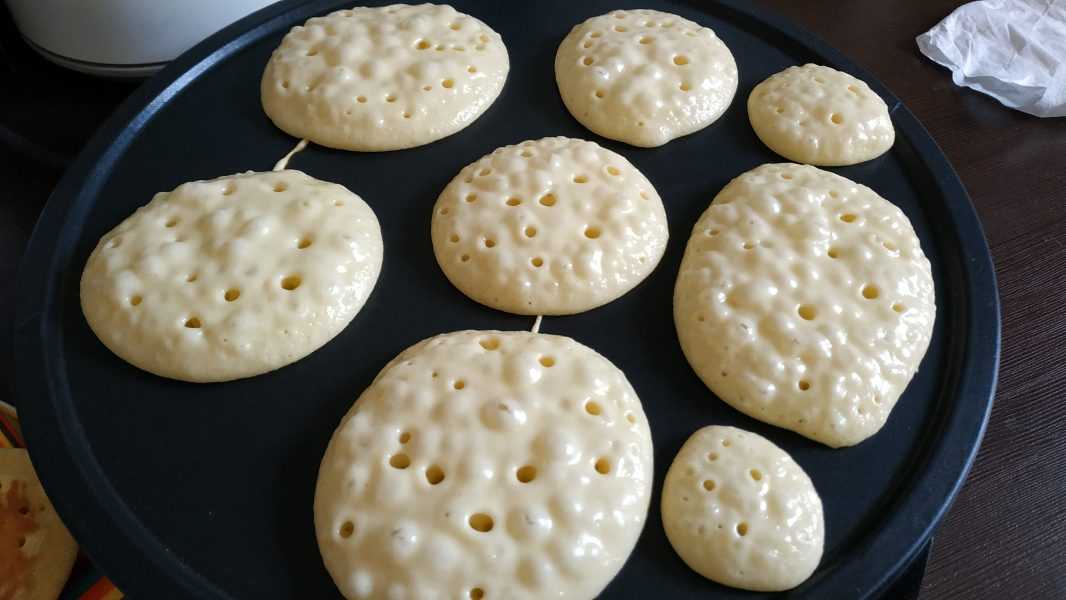 Приготовим сковороду с антипригарным покрытием и хорошо ее разогреем на огне. Выливаем на разогретую поверхность примерно половину половника еще раз перемешанного теста и ждем появления пузырьков. Сразу же задаем нужный размер, помним, что это небольшие по размеру и пышные блинчики.