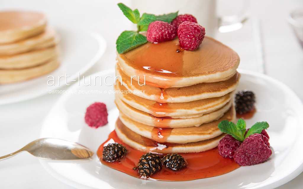Переворачивают на другую сторону, прожаривают до румяной корочки. И так с каждой порцией. На десертную тарелку панкейки складывают в виде стопочки или как закуску. Подают к чаю с вареньем или джемом.