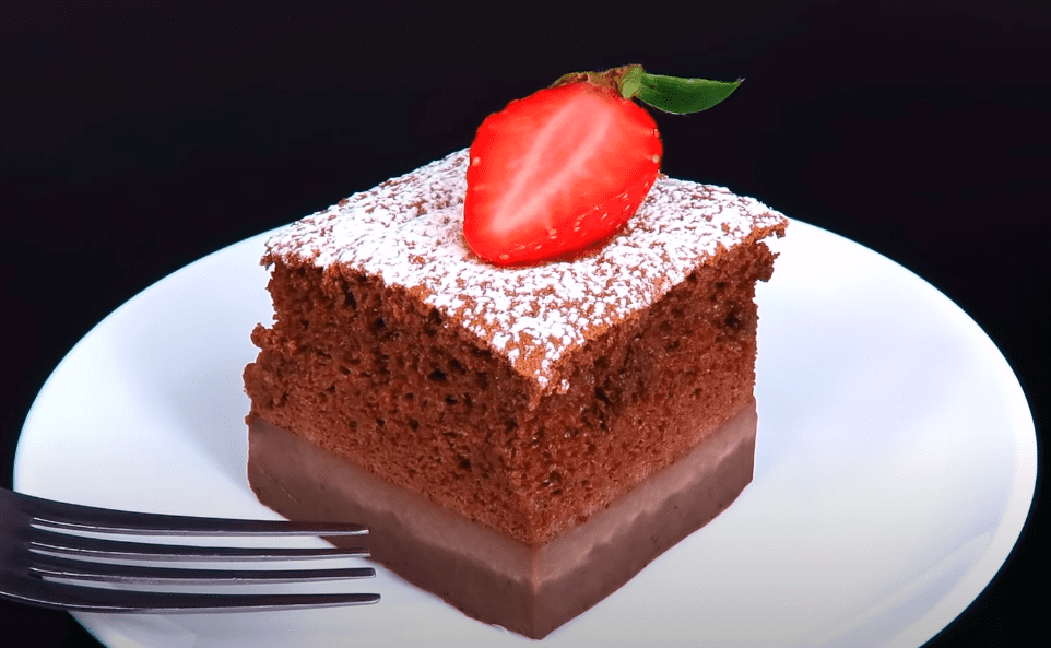 Тесто для этого десерта называется «умным», потому что в процессе выпекания оно само разделяется на три слоя: бисквит, суфле и заварной крем. Десерт получается нежным и воздушным. Шоколадные бисквитные пирожные буквально тают во рту.