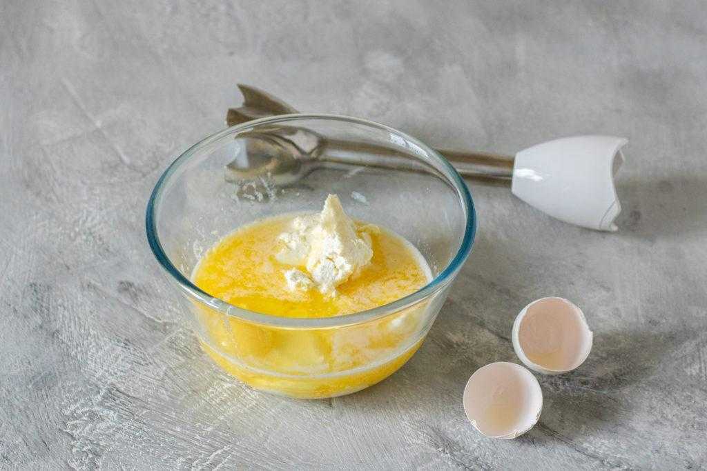3. Добавьте к теплому маслу яйцо, творог и соль. Пробейте блендером.