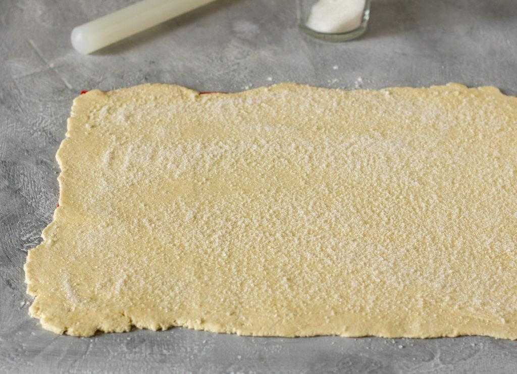 6. Раскатайте тесто в 5-миллиметровый пласт и равномерно присыпьте половиной сахара.