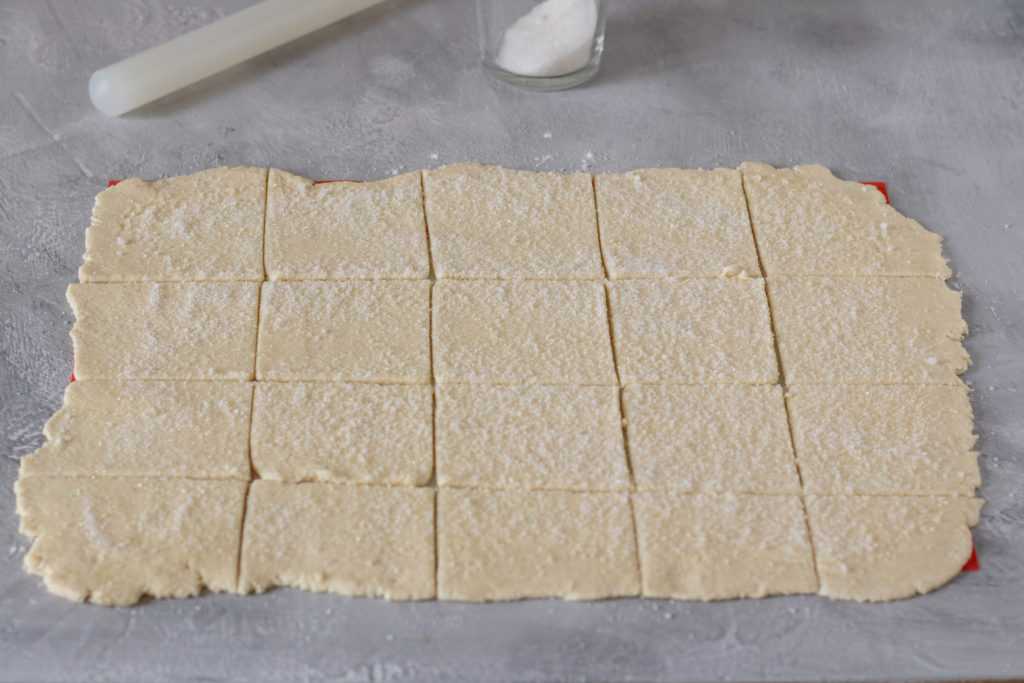 7. Разрежьте пласт на примерно одинаковые квадраты. Для идеально ровных треугольников вы можете нарезать тесто до посыпания сахаром, используя линейку и повторно раскатывая обрезки.