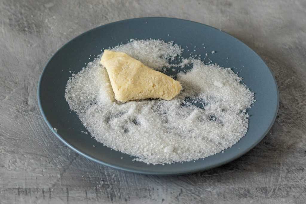 Обмакиваем одну сторону в сахар складываем пополам и снова обмакиваем в сахарном песке, затем снова складываем пополам. Далее необходимо наш конвертик примять и снова обмакнуть в сахаре.
