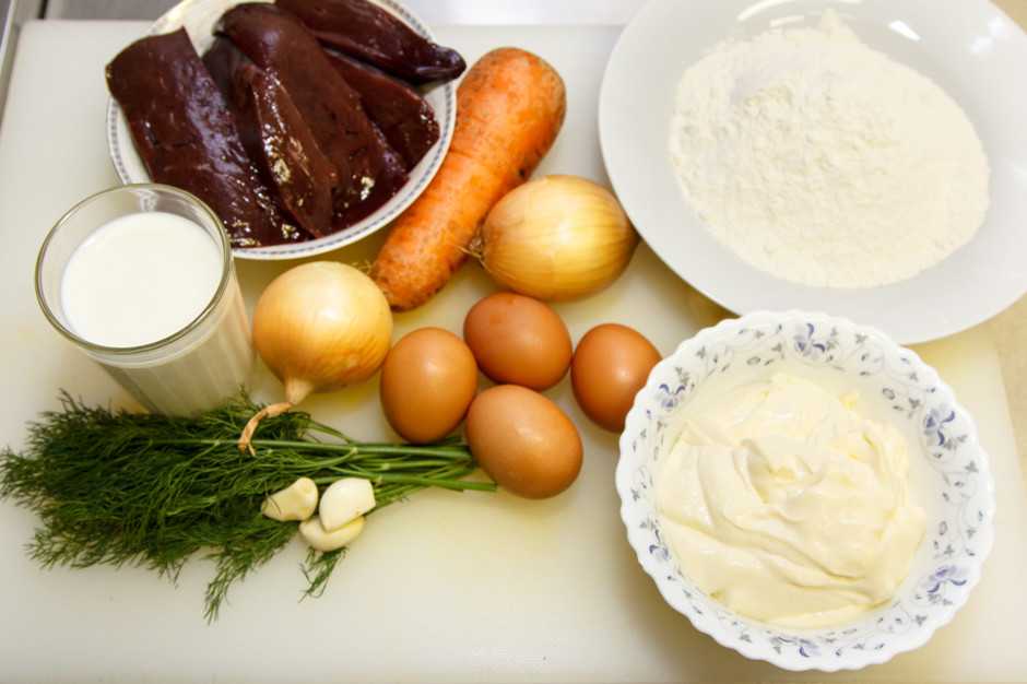 Вам потребуется: — 600 г печени. — 200 г лука. — 200 г моркови. — 100 г муки. — 100 мл молока. — 2 яйца. — 3 зубчика чеснока. — 400 г сметаны (у меня 15%). — 1 пучок зелени.