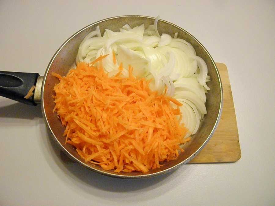 - На сковороде потушить морковь, затем добавить лук, продолжать тушение до мягкости овощей. Посолить, поперчить, оставить остывать.
