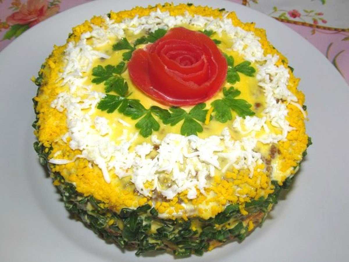 9. Таким образом, чередуя слои, собираем весь торт. Самый верхний корж смазываем майонезом. Украшаем укропом и обжаренными дольками грибов.