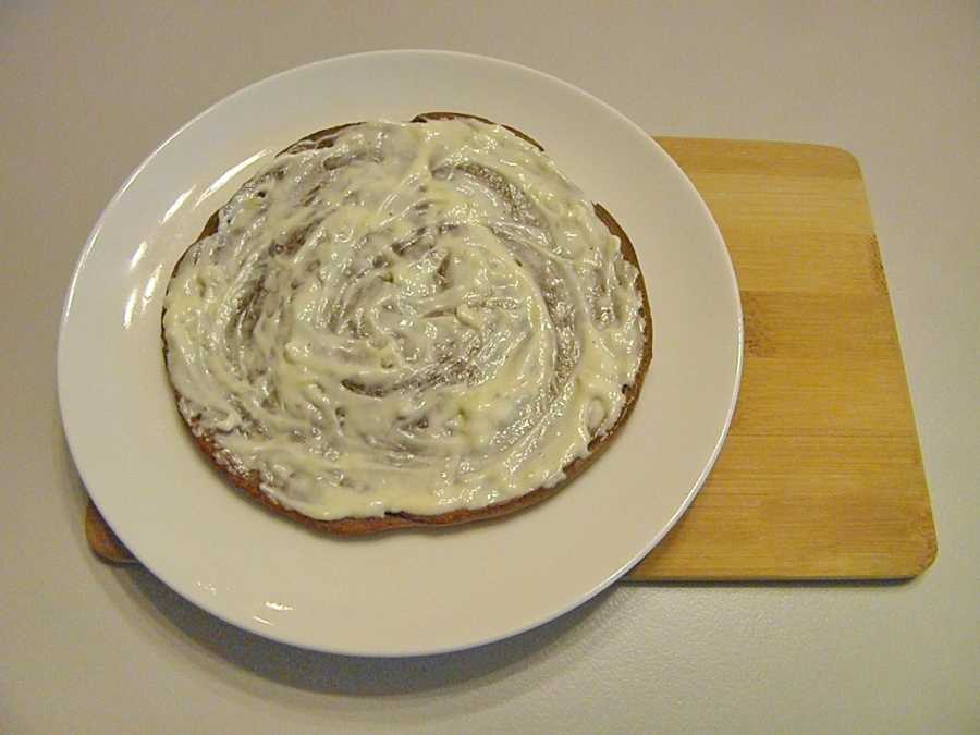 - Первый корж намазать майонезно-чесночным соусом, выложить и распределить обжаренную морковь с луком, положить следующий корж и повторить процедуру. Верхний корж и бока смазать соусом, обсыпать зеленью