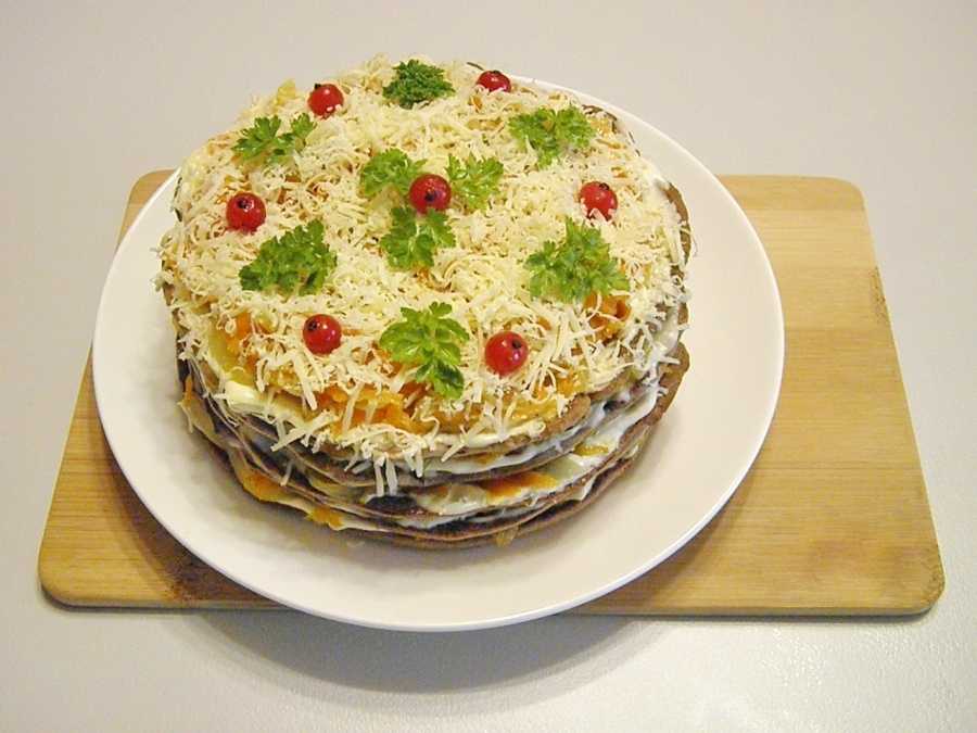 Печеночный торт из говяжьей печени с блинами по классическому рецепту