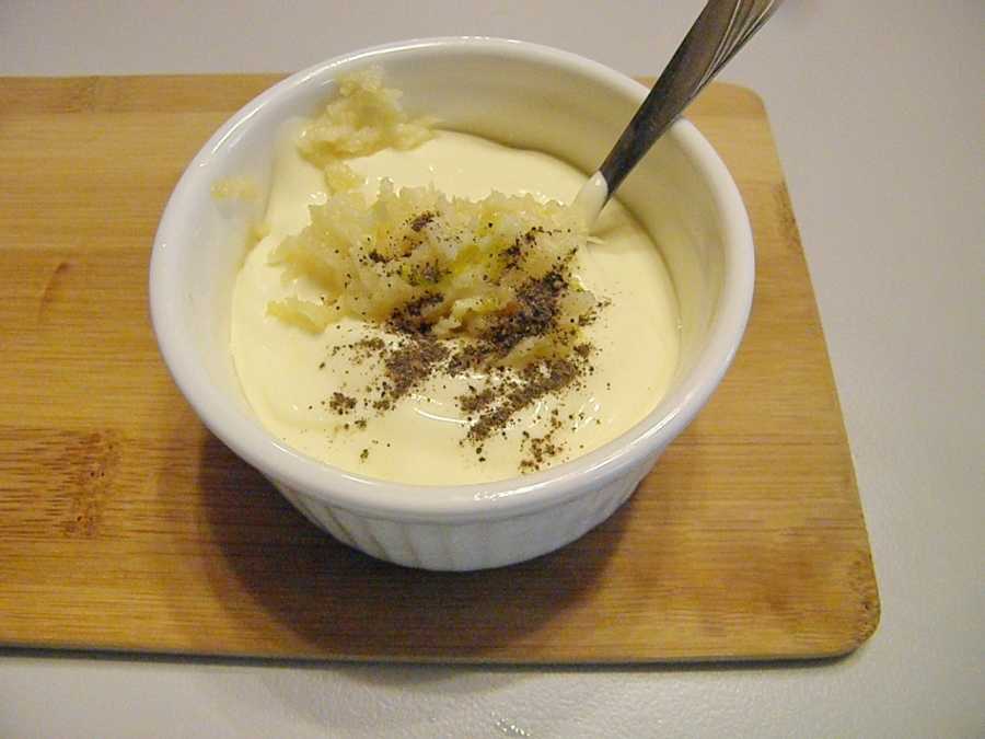 - Готовим заправку из плавленого сыра, майонеза чеснока.