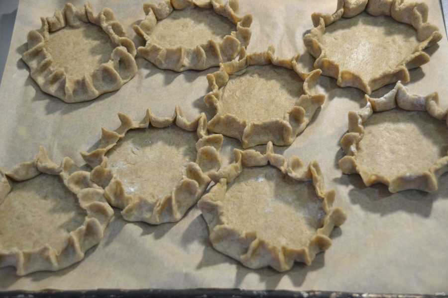 Делим тесто на 6 частей, раскатываем тесто толщиной 3-4 мм кружки размером примерно 15 см. Края лепешки защипываем, чтобы получилась корзиночка с бортиками. Накалываем дно вилкой.