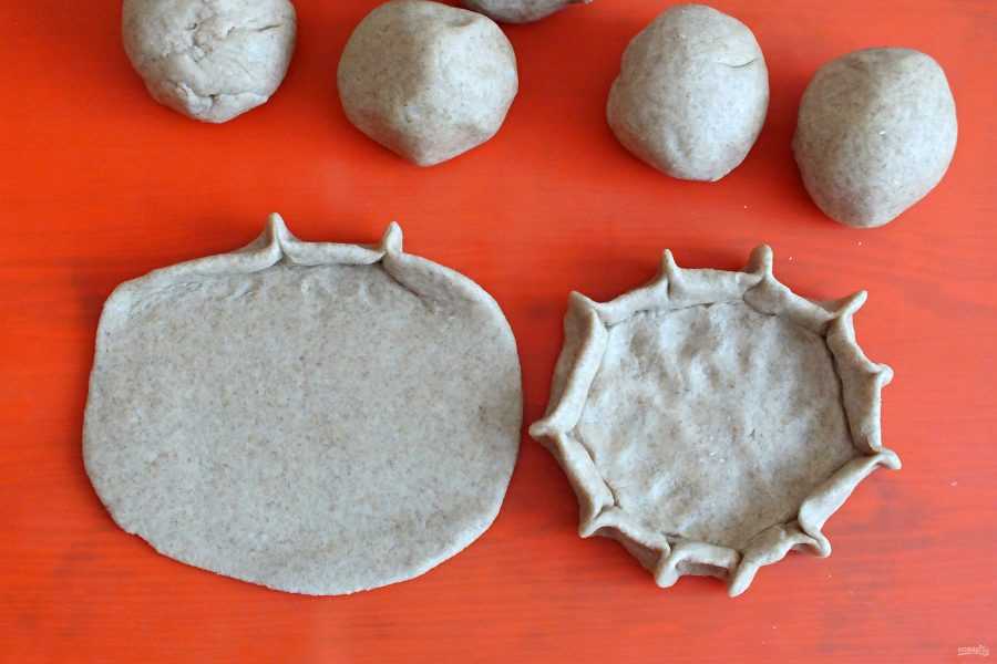 Из теста сделайте одинаковые лепешки диаметром 10-12 см, поднимите по краям бортики.
