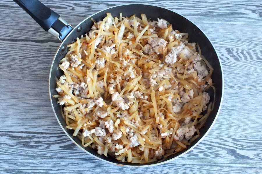 Репчатый лук (1 луковицу среднего размера) мелко шинкуем и пассируем на растительном масле до золотистого цвета. Добавляем фарш (300 г) и обжариваем до готовности. Добавляем соль и перец по вкусу.