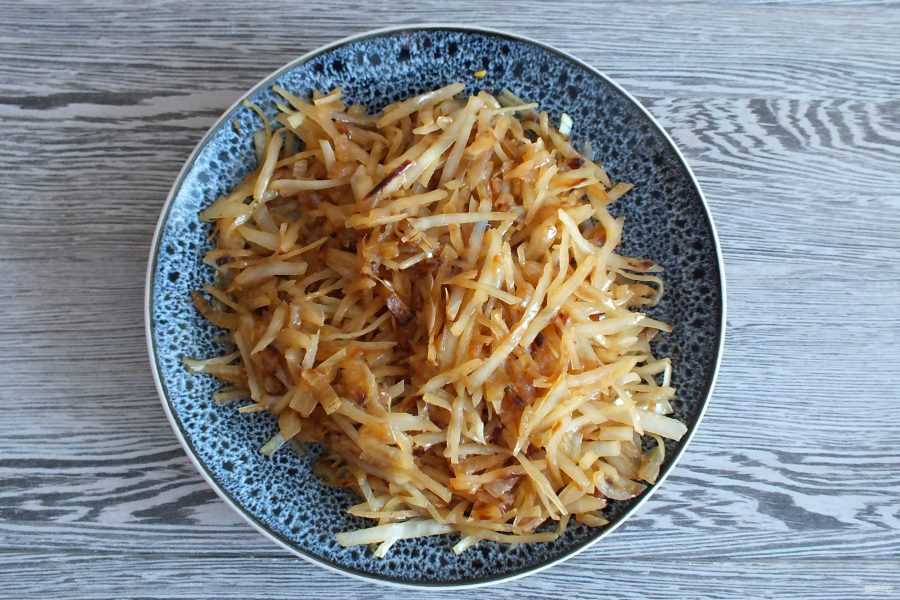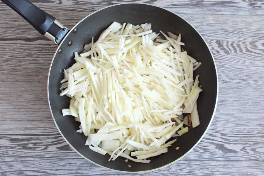 Капусту нарежьте тонкой соломкой, добавьте к луку. Обжаривайте все вместе до готовности капусты. В конце подсолите.