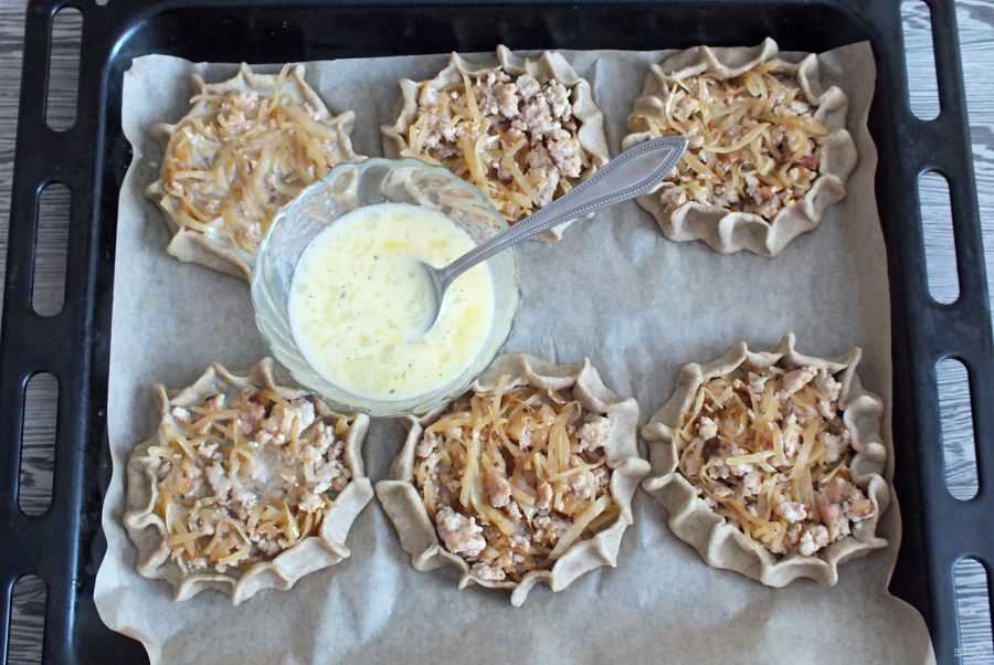 Противень смазываем маслом и выкладываем на него получившиеся корзиночки. Кладем в них начинку. Она должна лежать вровень с бортиками. Заливаем омлетной массой – примерно 3-4 ч. ложки на одну перепечу.
