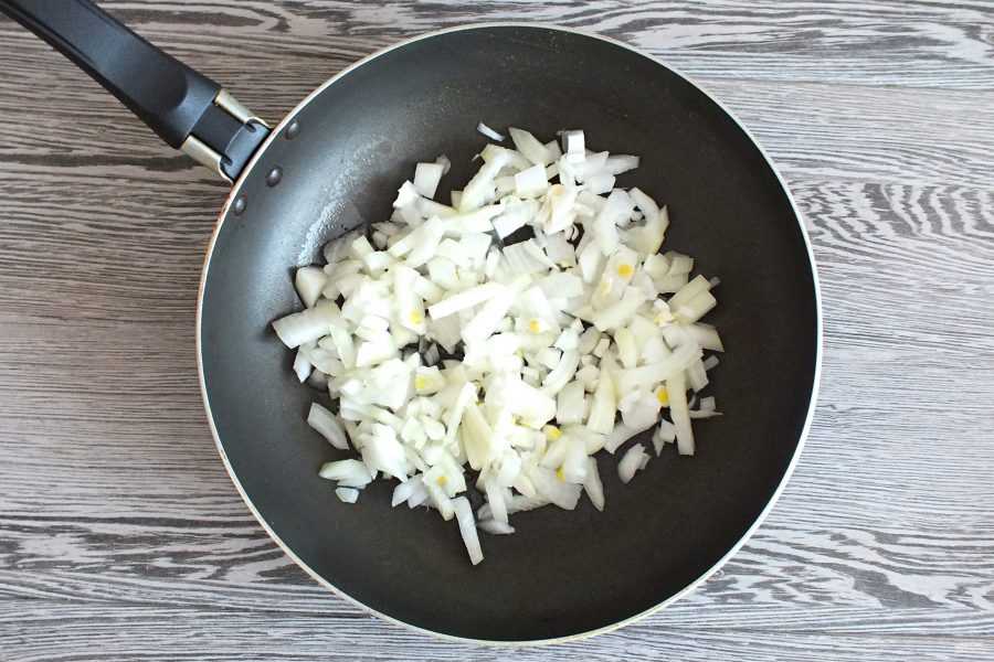 Сделайте начинку. В сковороде разогрейте растительное масло. Нарежьте произвольно лук и обжарьте на умеренном огне до мягкости.