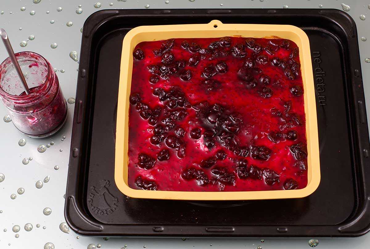 - наибольшую часть начинки выложить на тесто, сверху разложить 80 г любого варенья, после чего вылить остатки начинки поверх варенья;