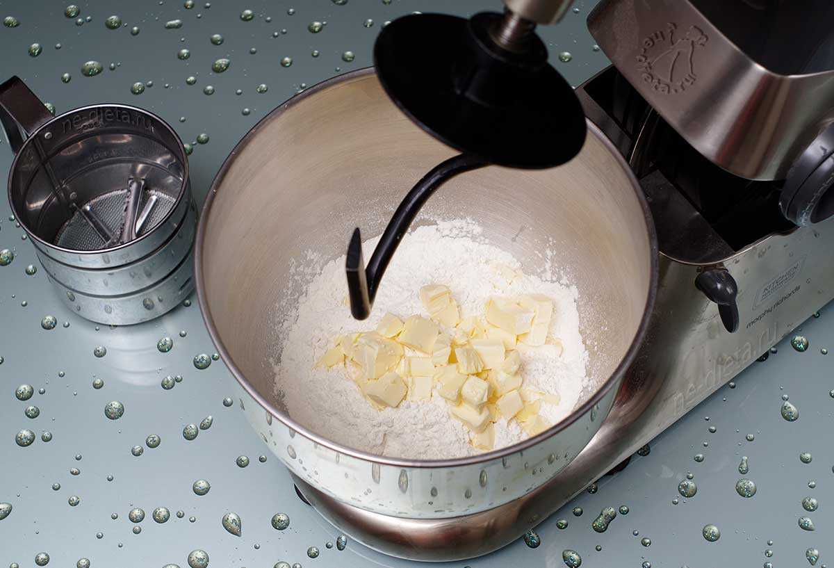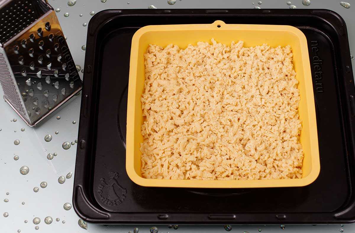 Если вы хотите получить изделие с более плотной песочной основой, то тесто будет тертым. Его вымешивают и после активного охлаждения натирают на терке, образуя крошку. Крошку используют для низа пирога и для верха, если пирог закрытый. Для такого теста потребуется: