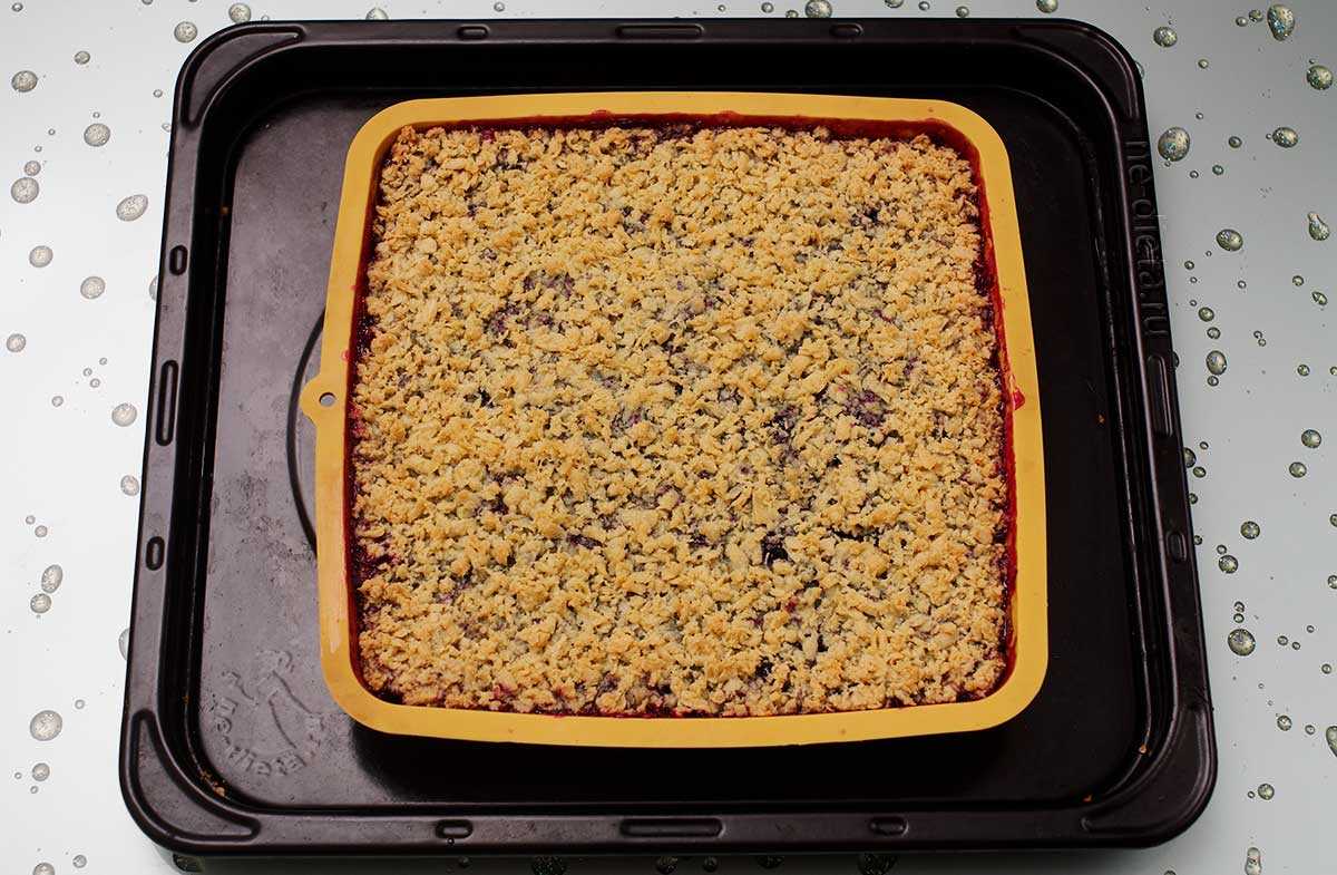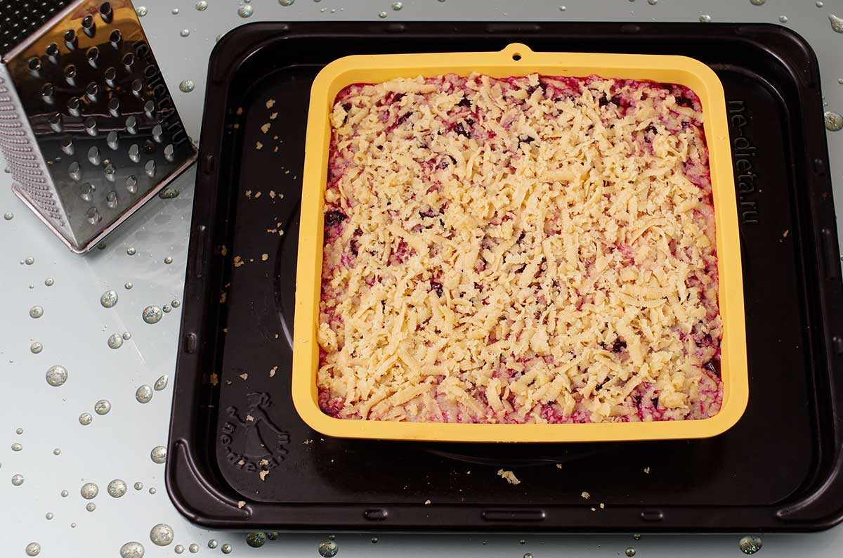 10.Сверху присыпьте оставшимся тестом, но уже не приминайте, а оставьте в таком рассыпчатом виде. Духовку разогрейте до 180º и поставьте пирог запекаться на 30 минут. Нужно, чтобы верх хорошо зарумянился.
