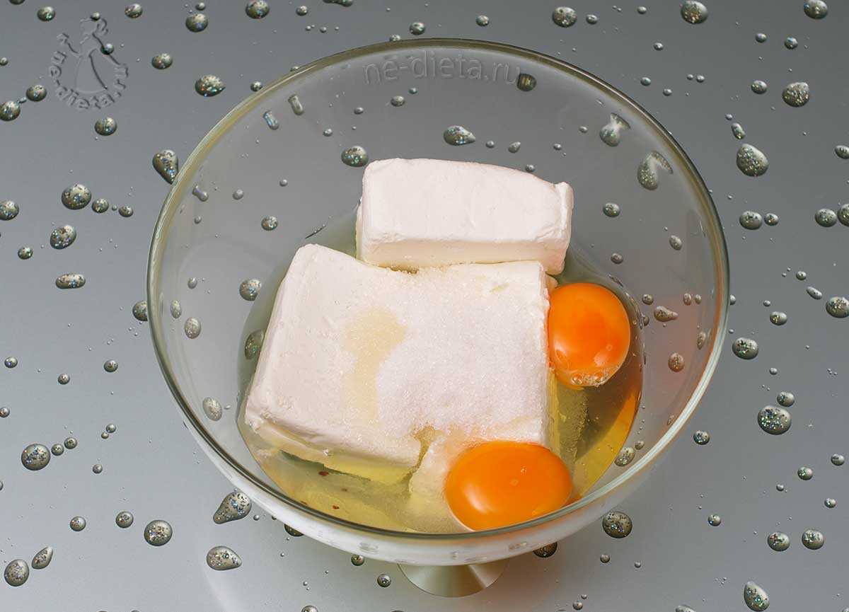 - 500 г творога растереть с 250 г сахарной пудры, вбить 3 яйца, размешать до однородности;