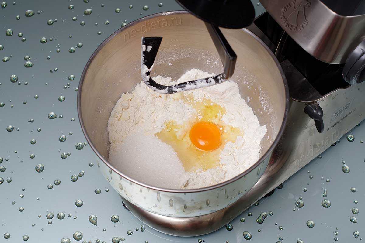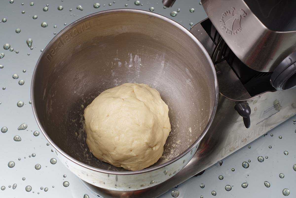 Замесить тесто руками или в комбайне с помощью насадки «крюк». Затем необходимо добавлять в тесто воду по одной столовой ложке, тщательно перемешивая, пока оно не начнет собираться в плотный комок.