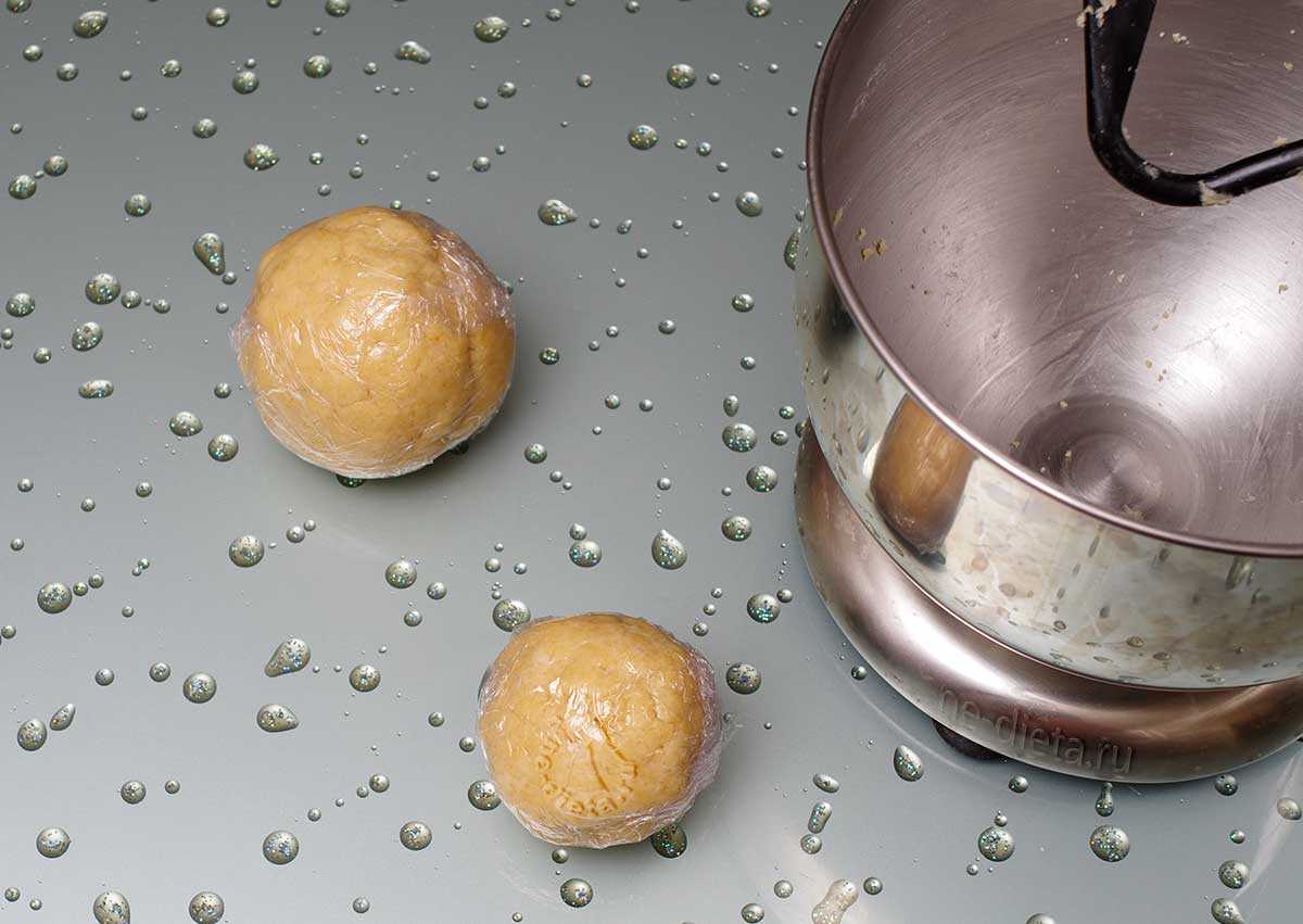 Получившееся тесто быстро собираем в единое целое, отделяем 100 гр., заворачиваем оба куска в пищевую пленку и в холодильник на 30 минут — 1 час.