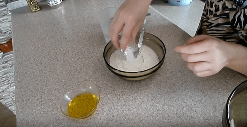 Все хорошо размешать. Муку подсыпаем частями. Ее обязательно надо просеять.