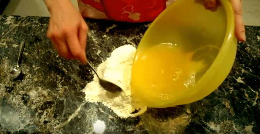 Просеиваем муку на стол, получается горка. Подсаливаем холодную воду. В муке, в центре делаем углубление и вливаем туда воду. Теперь потихоньку перемешиваем ингредиенты, можно ножом. Получается тесто.