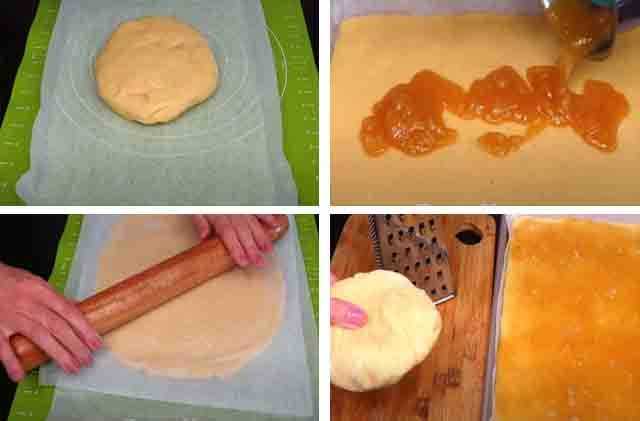 10. Возьмите второй кусок теста и раскатайте скалкой, а потом положите сверху на варенье. Или можно тесто потереть на терке. Здесь, для разнообразия показываю вариант цельного раскатанного куска.