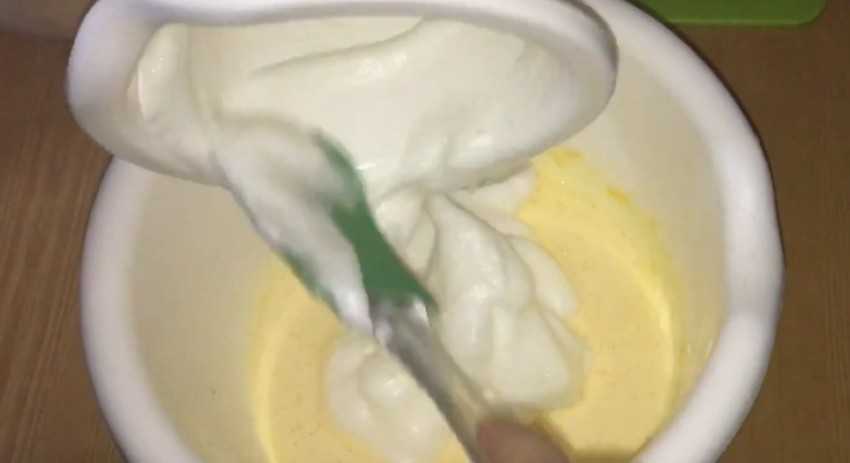 2. В белки всыпьте соль и взбейте миксером до образования пиков. Переложите белковую пену к массе из желтков, аккуратно перемешайте.