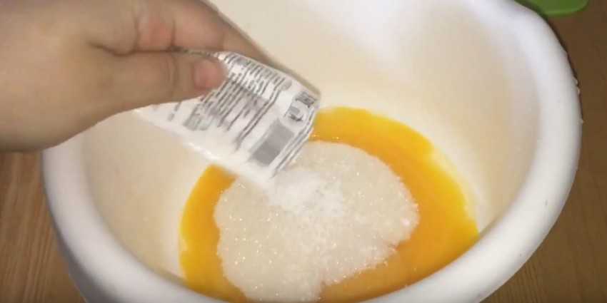 1. Отделите белки от желтков. К желткам добавьте сахар и пакетик ванилина, тщательно разотрите миксером.
