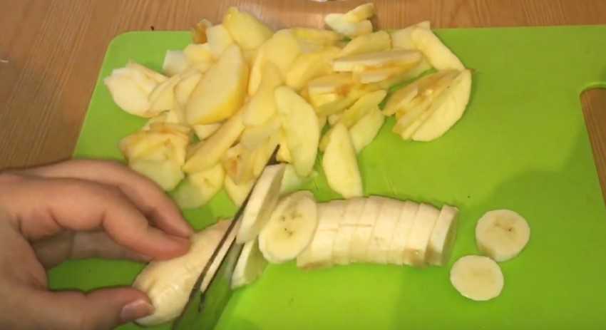 - Фрукты вымыть, порезать яблоки дольками, а бананы кружочками.