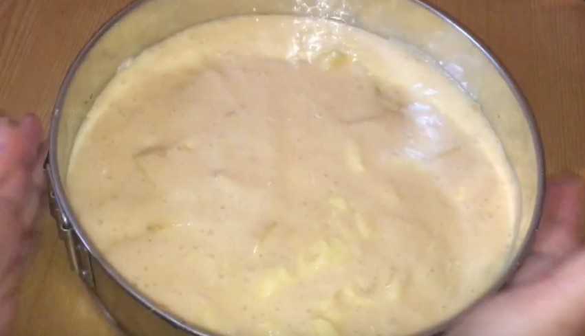 - Выложить их, чередуя, в смазанную маслом форму, после чего залить жидким тестом.