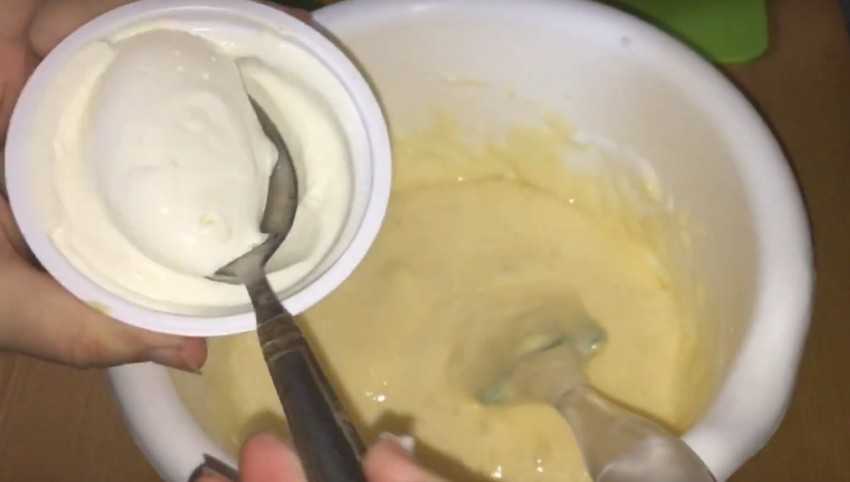 Яйца разбиваем, отделяя белки. Желтки соединяем с сахаром, добавляем йогурт, растираем и вливаем растительное масло. Всыпаем разрыхлитель и начинаем понемногу подсыпать муку, которую нужно предварительно просеять. Тесто должно быть негустым, похожим на сметану.