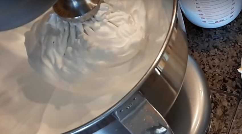 - В массу добавляют ванильный порошок, разрыхлитель, немного соли, просеянную пшеничную муку и снова замешивают – получается слегка густоватое, но текучее тесто. Яичные белки взбивают в густую пену с оставшимся сахаром с помощью миксера. Взбитый белок добавляют к основному приготовленному тесту и перемешивают деревянной ложкой.