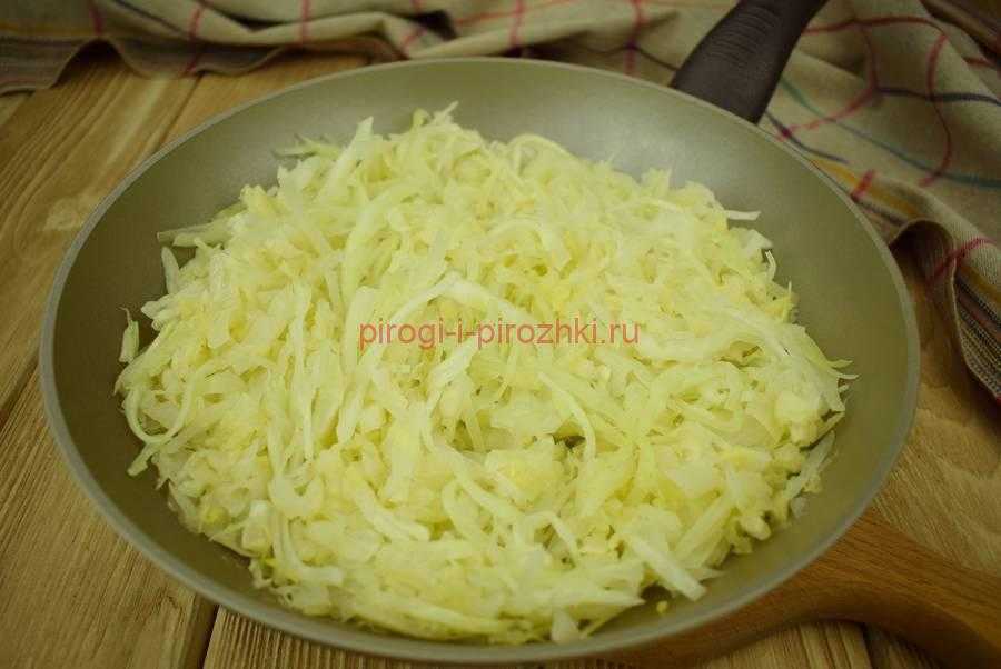 1. Для начинки берем квашеную либо кислую капусту и выкладываем в дуршлаг для того, чтобы стек лишний сок. Одну луковицу нарезаем максимально мелко и обжариваем вместе с капустой около 7-10 минут до румяности ингредиентов, не забываем посолить и поперчить овощи по своему вкусу.