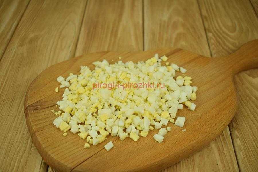 4. Мелко порезать зелень, покрошить яйца, посолить и перемешать. Затем добавить сметану, с ней будет не только вкуснее, но и начинка получится более «собранной», не будет рассыпаться.