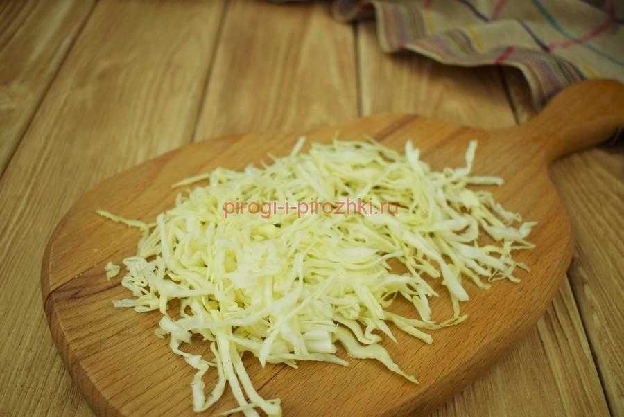 Пока замес поднимается, займёмся начинкой. Нарежьте белокочанную капусту тонкой соломкой, слегка посолите, после чего немного помните руками, чтобы вышел сок.