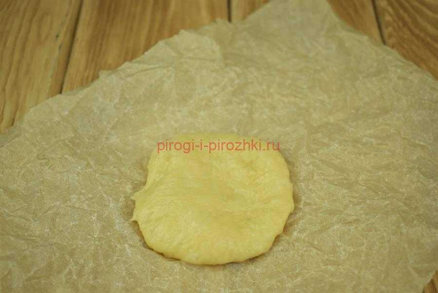 Готовое тесто обмять, разделить его на 16-18 частей. На столе, присыпанном мукой, из каждой части теста сформировать лепешку, в середину которой поместить по 1 столовой ложке начинки.
