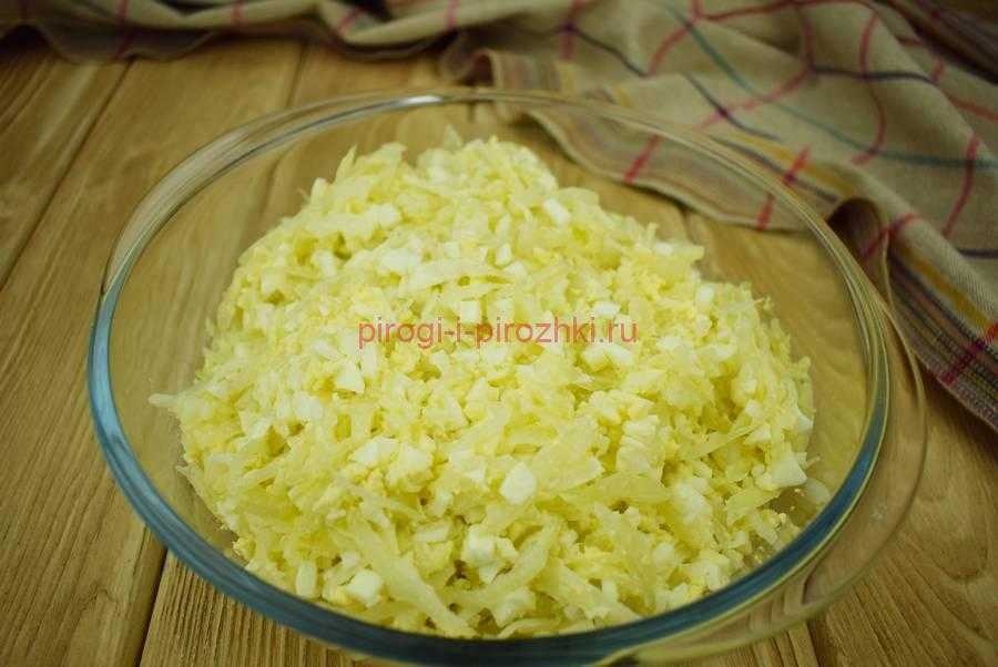 7. В остывшую капусту высыпаем натертые на крупную терку или нарезанные кубиками вареные яйца, зелень. Солим и перчим по своему вкусу.