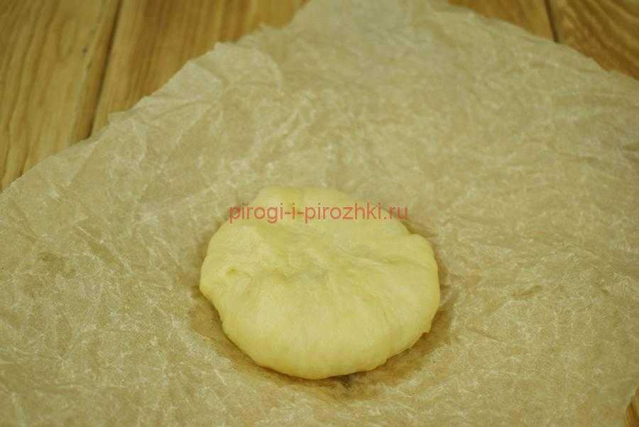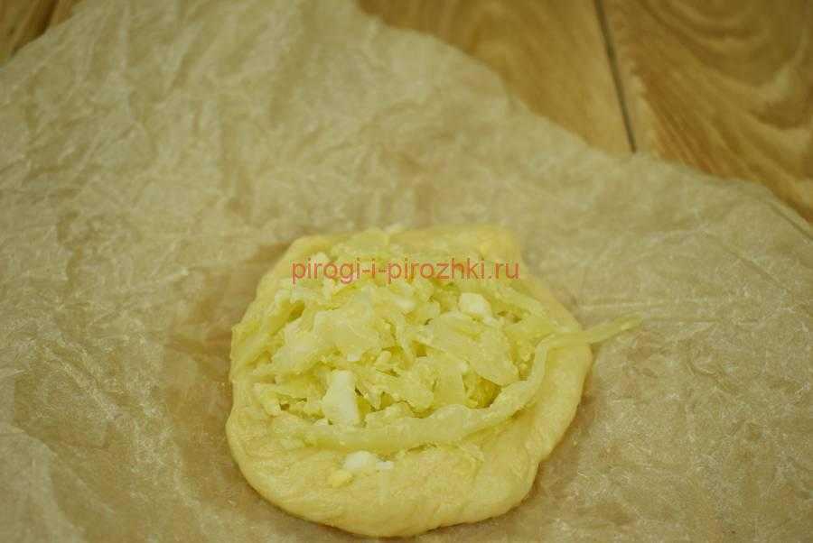 10. Формируем лепешки толщиной 0,5 см, выкладываем на каждую начинку и лепим пирожки. Выкладываем их швом вниз на противень с пекарской бумагой и даем капельку подрасти в теплом месте. Накрываем пленкой или чистым полотенцем, чтобы не заветрились.
