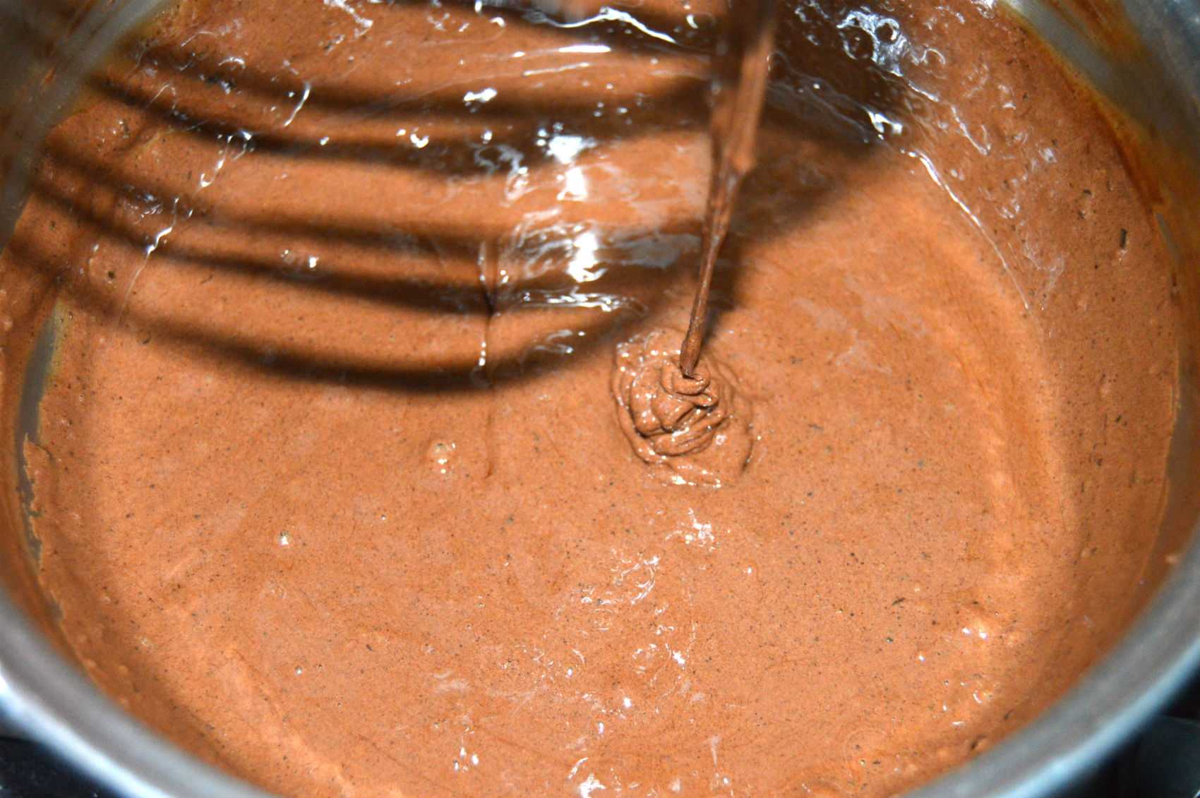 Приготовление массы совсем не сложно, важно только сначала перемешать пудру с какао и просеять смесь, добавить воды по рецепту и поставить на самый малый огонь. В процессе нагревания масса станет более жидкой. Далее нужно довести ее до кипения и проварить при постоянном помешивании около 5 минут