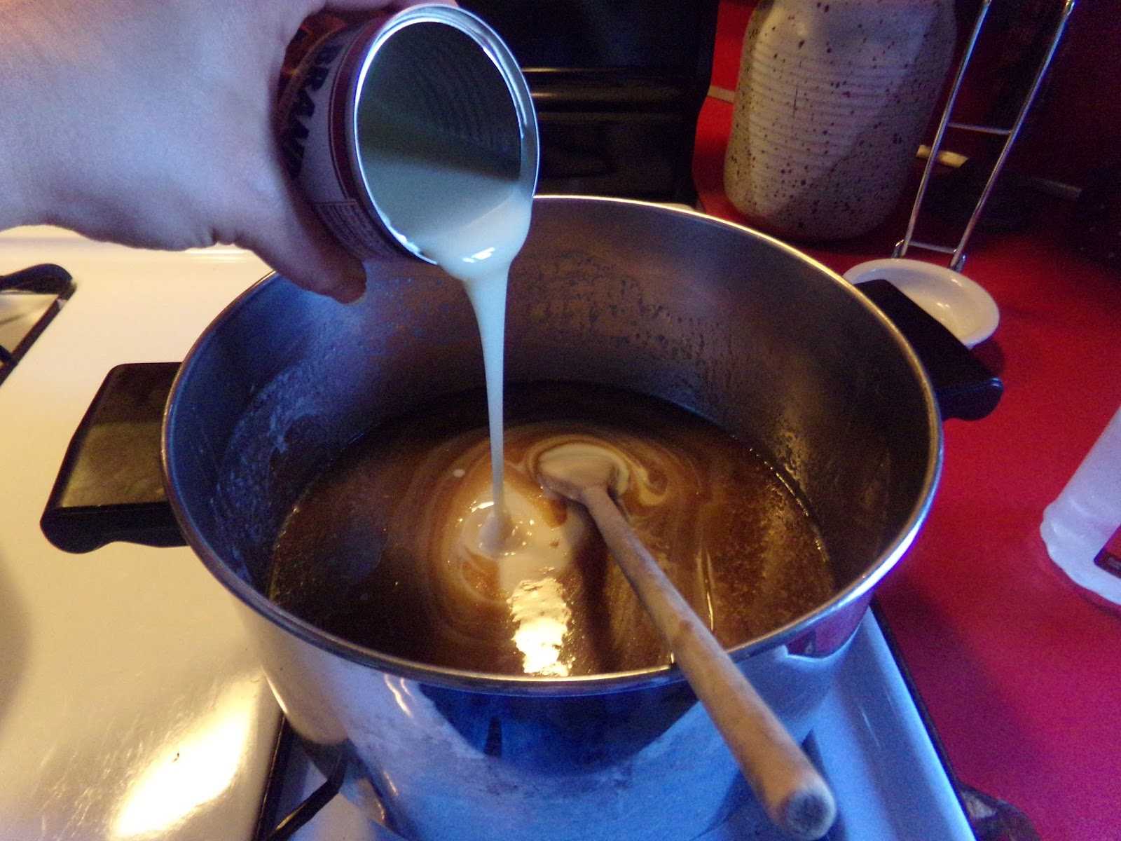 Если смесь слишком жидкая, можно немного увеличить время ее уваривания (до 7 минут) и кипятить до получения сметанообразной консистенции (проба на мягкий шарик). На этом этапе и будет понятно, нужно добавить жидкости или нет