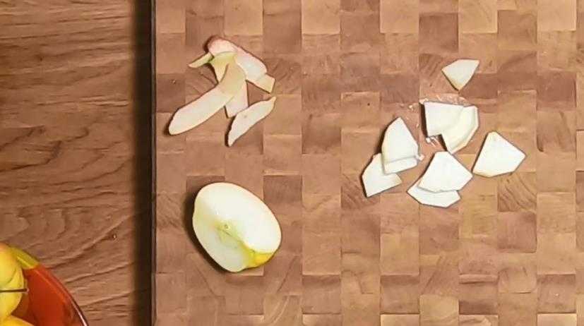 - Почистить от кожуры и семян яблоко, порезать кубиками, засыпать тростниковым сахаром;