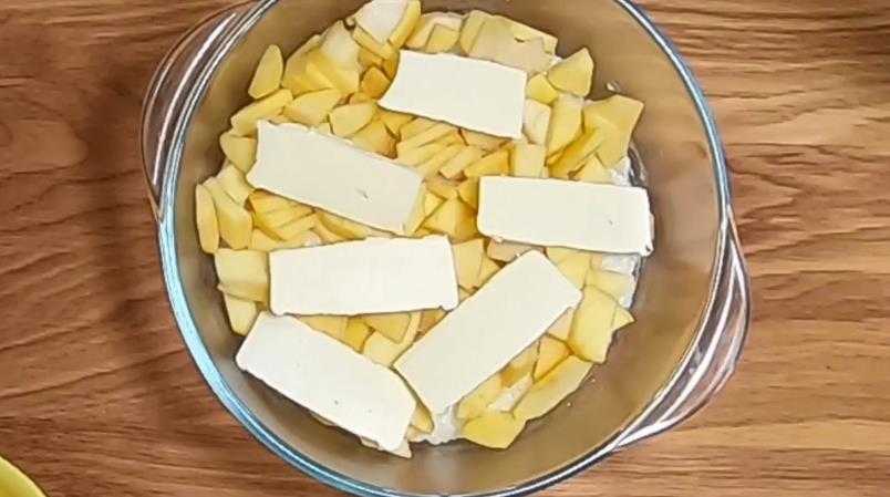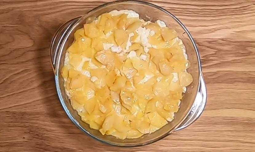 Половину готовой рисовой массы выложить в огнеупорную форму. Сверху посыпать половиной яблочных ломтиков и кубиками сливочного масла.