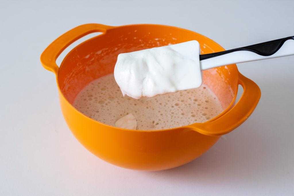 В однородную пышную смесь вводим сметану и продолжаем взбивать.