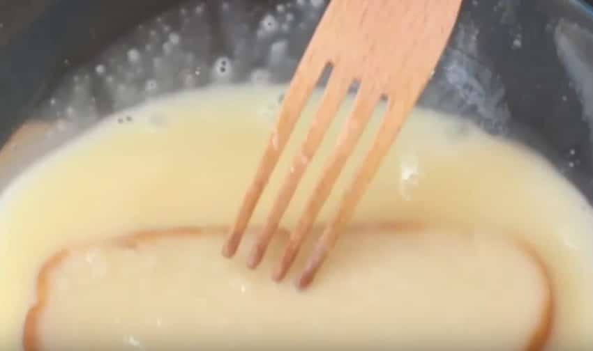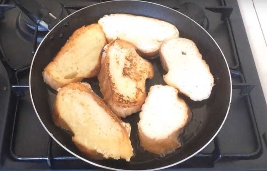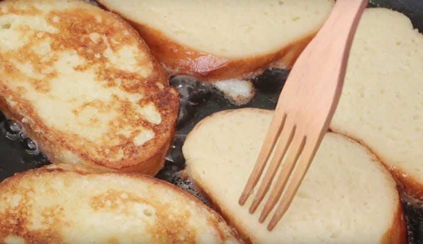 - Ломти булки хорошенько смачивайте в сливочной смеси, после чего выкладывайте их обжариваться. Пусть батон прожариться с одной стороны, после чего переверните его, и обжарьте с другой до коричневатого оттенка.